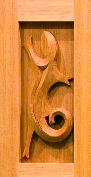 The carvings on the instrument are based on southwest Indian motifs realized in the classical European aesthetic of symmetry, motion, and proportion to harmonize the traditional structure of the pipe organ with the native surroundings. The main element in the design is the rain bird, chosen as the metaphor to symbolize rain in the desert. Based on Hopi precedents, it is recognizable within the carvings as an inward curved head and beak with two large stylized feathers pointing upward. These elements were then combined to create the bulk of the carving seen. Also, in keeping with the rain motif, there are two rain serpents in “san ildefonso” tradition at the top center of the organ on either side of the central star/sun. Almost forgotten, at the bottom of the four largest vertical posts, are geckos to symbolize the ground or earth.